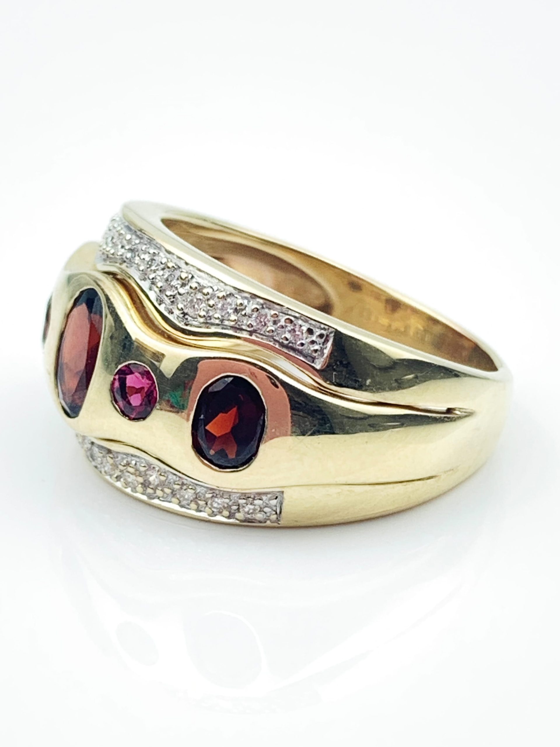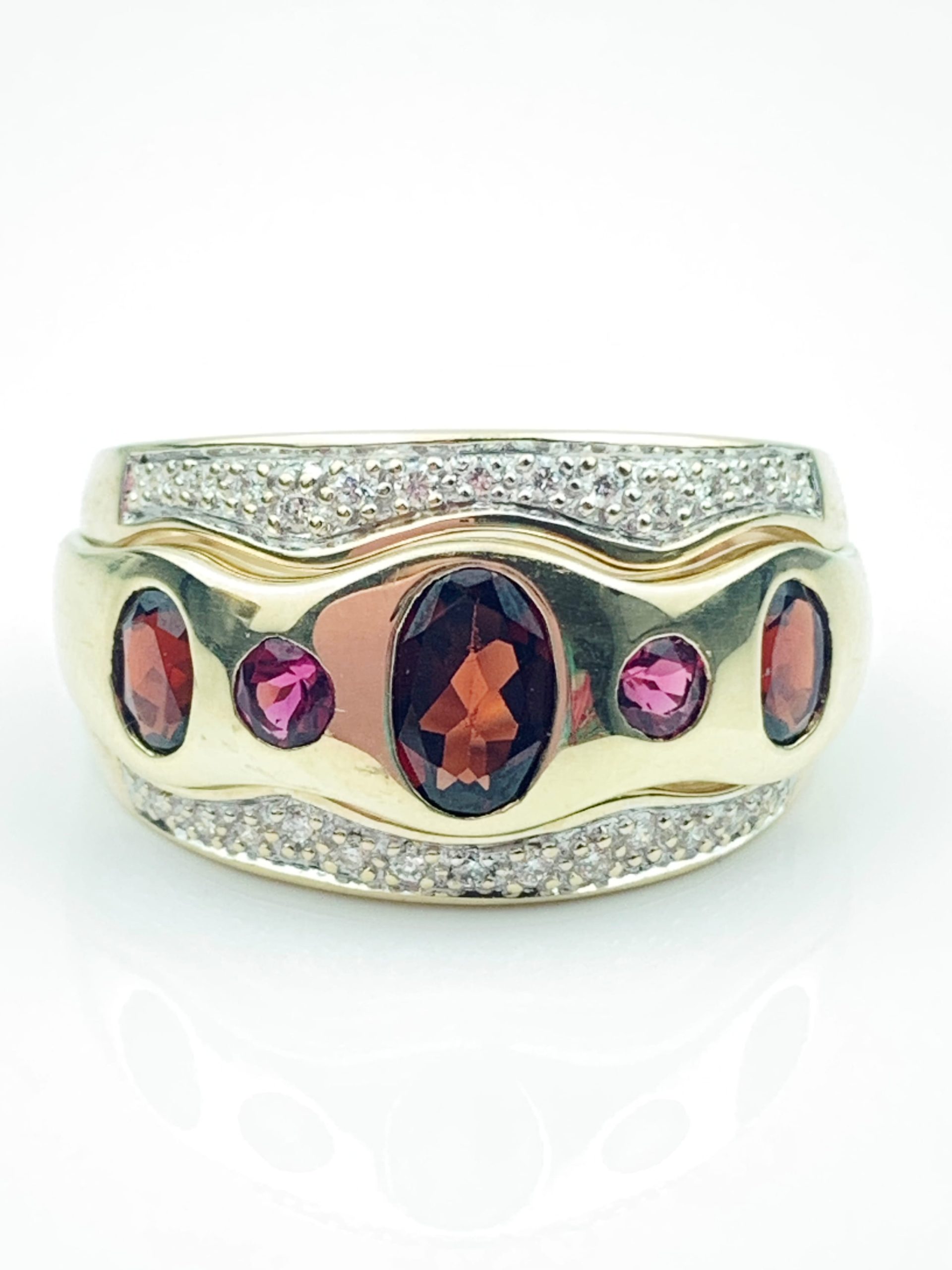 9ct Garnet, Pink Sapphire & Diamond Wide Gold Ring