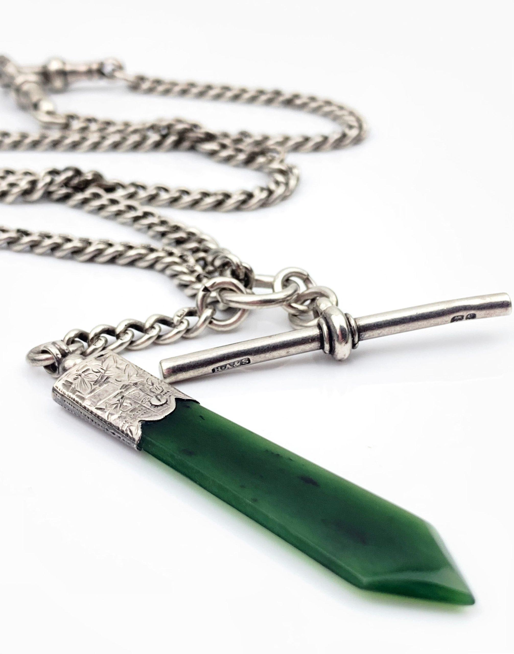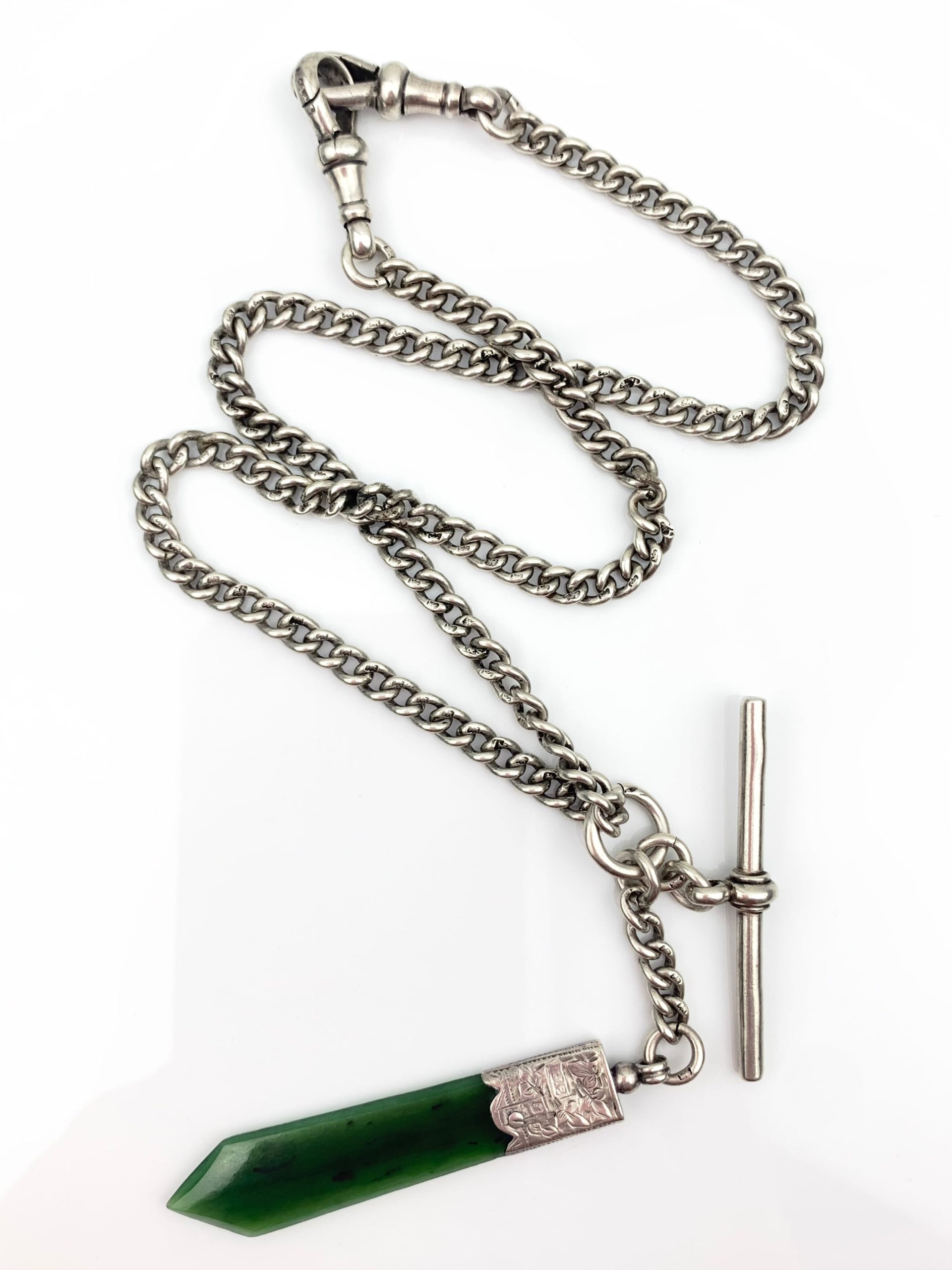 Antique Sterling Silver Albert Chain Fob Necklace Nephrite Jade Pendant & T-Bar