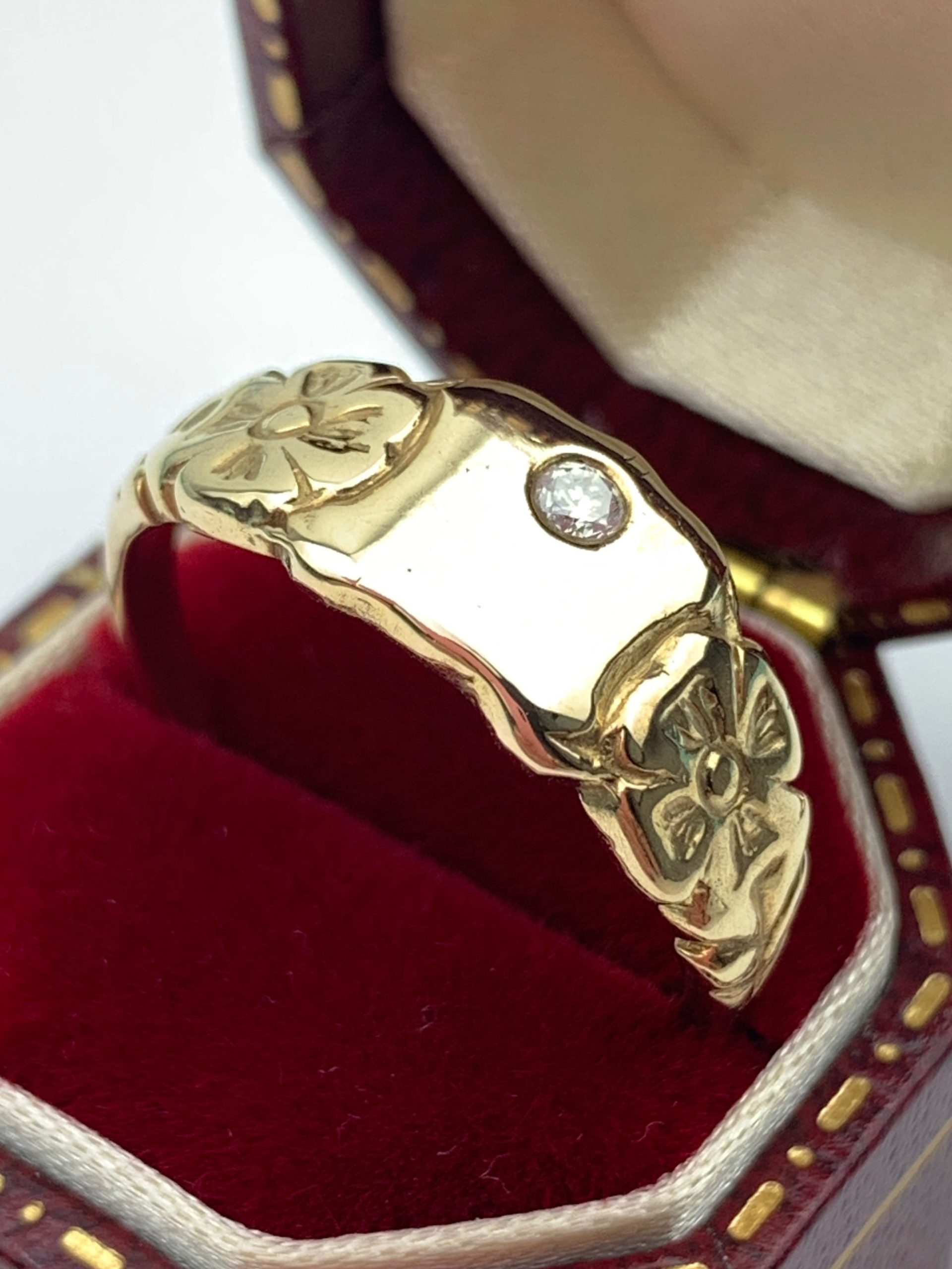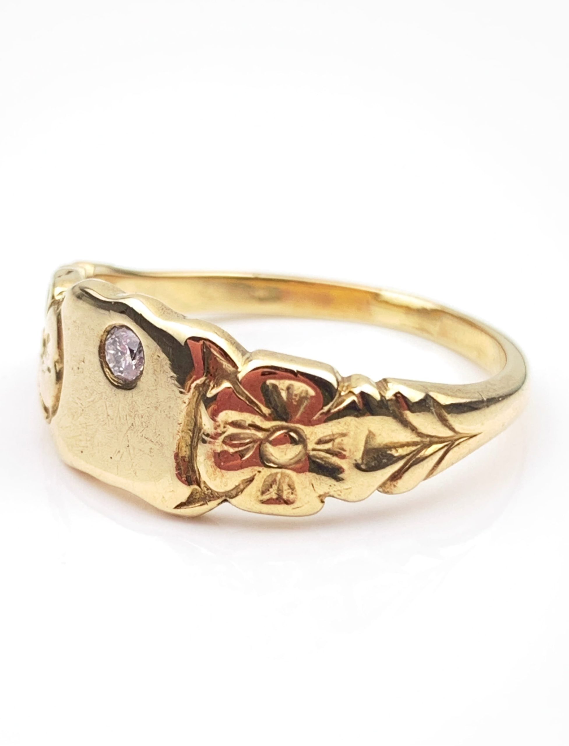 Vintage 9ct Yellow Gold Diamond Signet Ring with Floral Motif